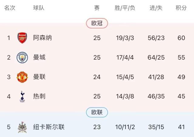 这场补赛过后,阿森纳和曼城的场次同为25场,兵工厂以5分的优势领跑。而前段刚刚加入联赛争冠行列的曼联,则在少赛一场的情况下,落后榜首11分。英格兰媒体认为在这场补赛过后,场次相同的阿森纳和曼城将各自进入到一段冲刺期,两队将在7轮联赛后再次相遇,那可能将是最终决定联赛冠军归属的一场决战较量!
