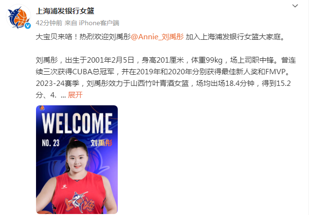mk体育入口-上海女篮官宣:大宝贝刘禹彤加盟 两届全明星新赛季继续穿23号